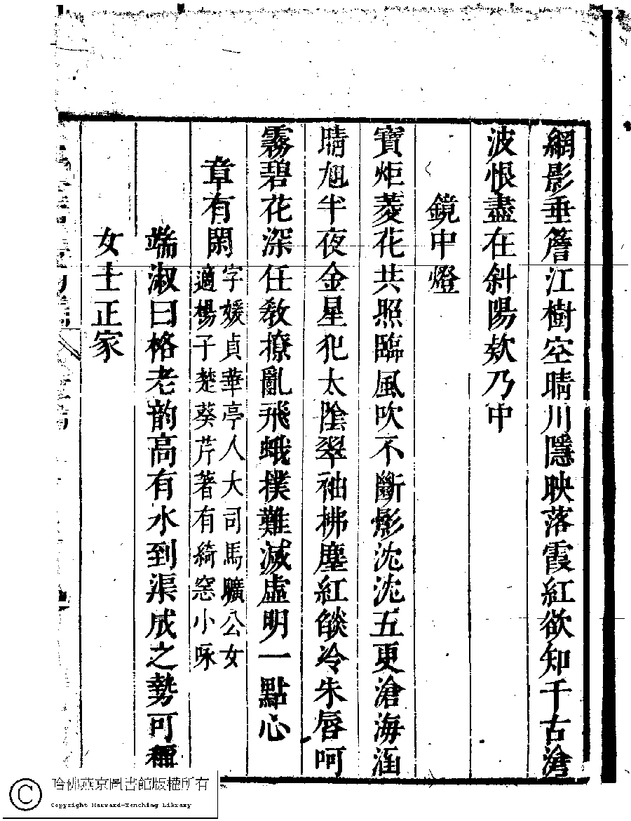 | (PRINT FRIENDLY VERSION) 名媛詩緯初編(清王端淑輯)。清康熙六年(1667)清音堂刻本 ![]() Page : 14.7a | click for larger image | Back |