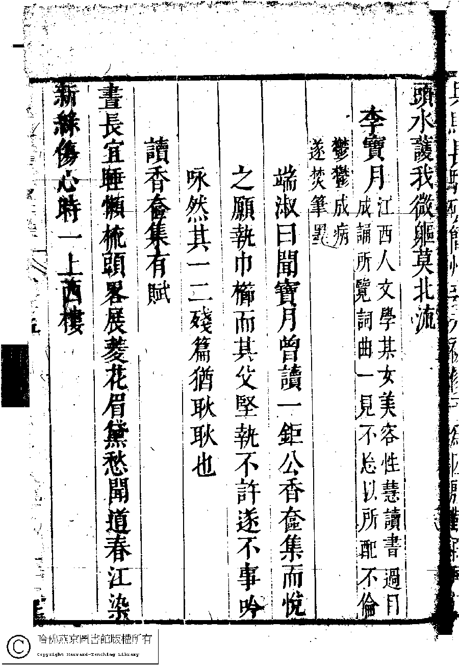 | (PRINT FRIENDLY VERSION) 名媛詩緯初編(清王端淑輯)。清康熙六年(1667)清音堂刻本 ![]() Page : 15.19a | click for larger image | Back |