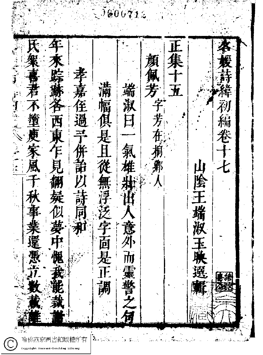 | (PRINT FRIENDLY VERSION) 名媛詩緯初編(清王端淑輯)。清康熙六年(1667)清音堂刻本 ![]() Page : 17.1a | click for larger image | Back |