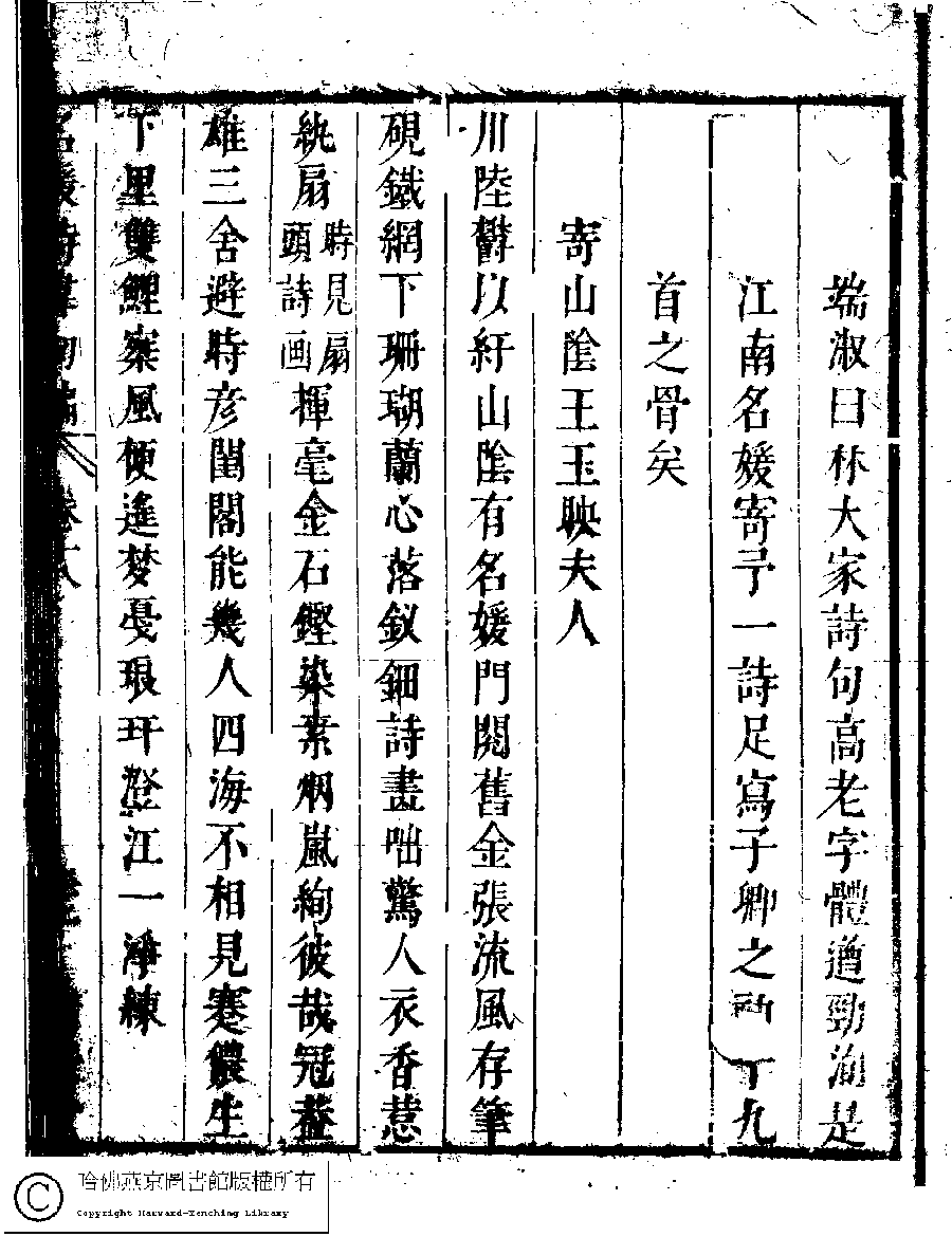 | (PRINT FRIENDLY VERSION) 名媛詩緯初編(清王端淑輯)。清康熙六年(1667)清音堂刻本 ![]() Page : 18.27a | click for larger image | Back |