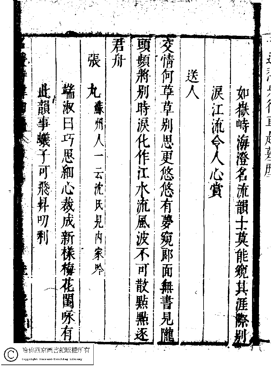 | (PRINT FRIENDLY VERSION) 名媛詩緯初編(清王端淑輯)。清康熙六年(1667)清音堂刻本 ![]() Page : 24.22a | click for larger image | Back |