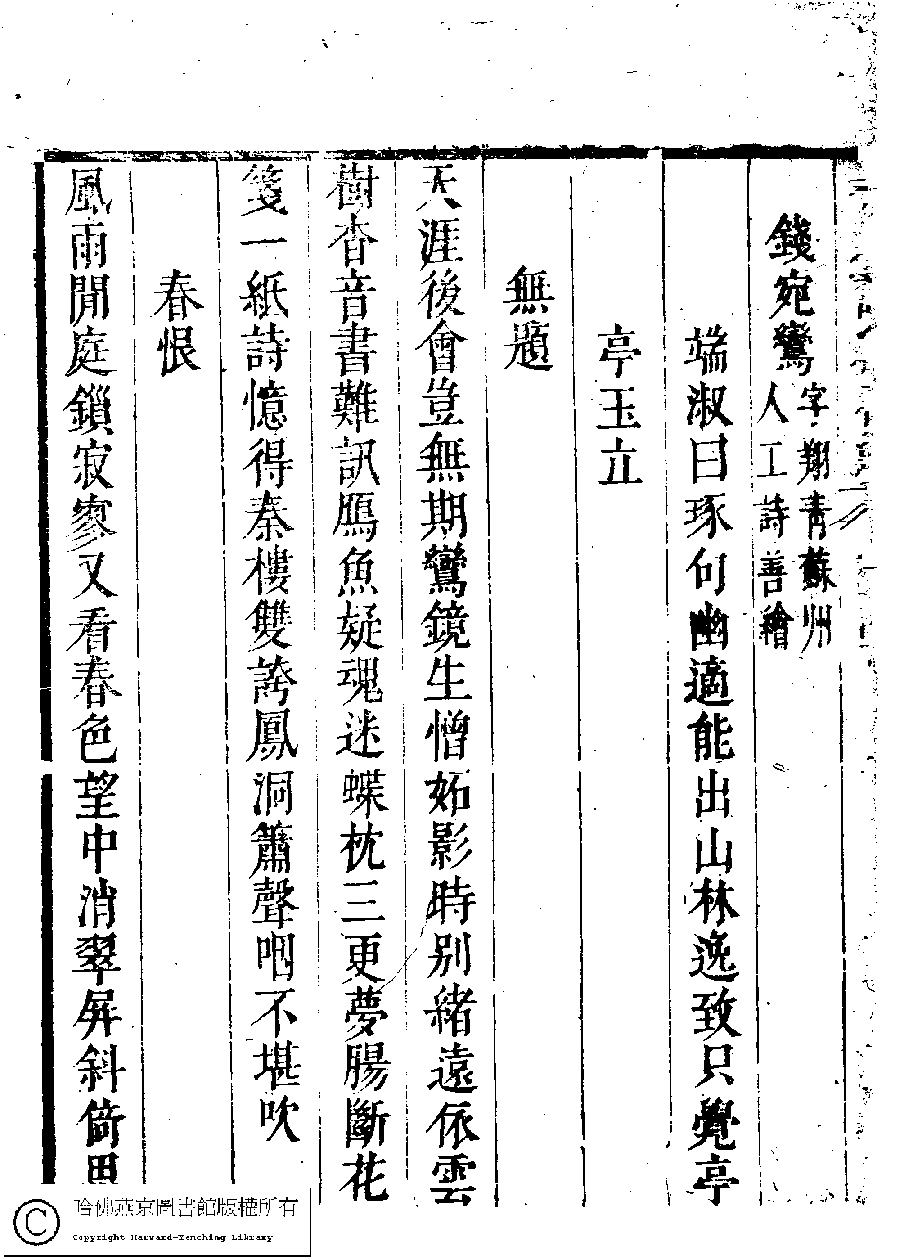 | (PRINT FRIENDLY VERSION) 名媛詩緯初編(清王端淑輯)。清康熙六年(1667)清音堂刻本 ![]() Page : 24.29b | click for larger image | Back |