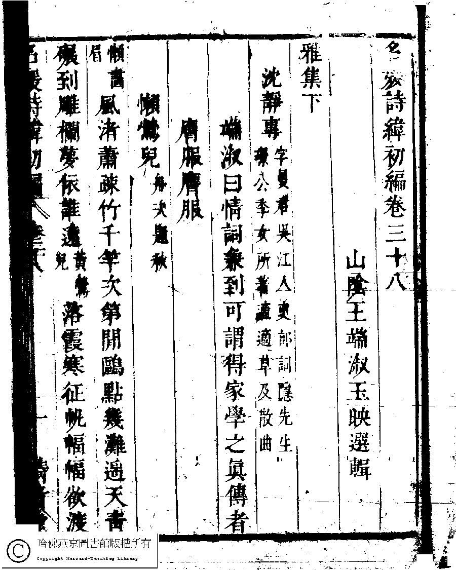 | (PRINT FRIENDLY VERSION) 名媛詩緯初編(清王端淑輯)。清康熙六年(1667)清音堂刻本 ![]() Page : 38.1a | click for larger image | Back |