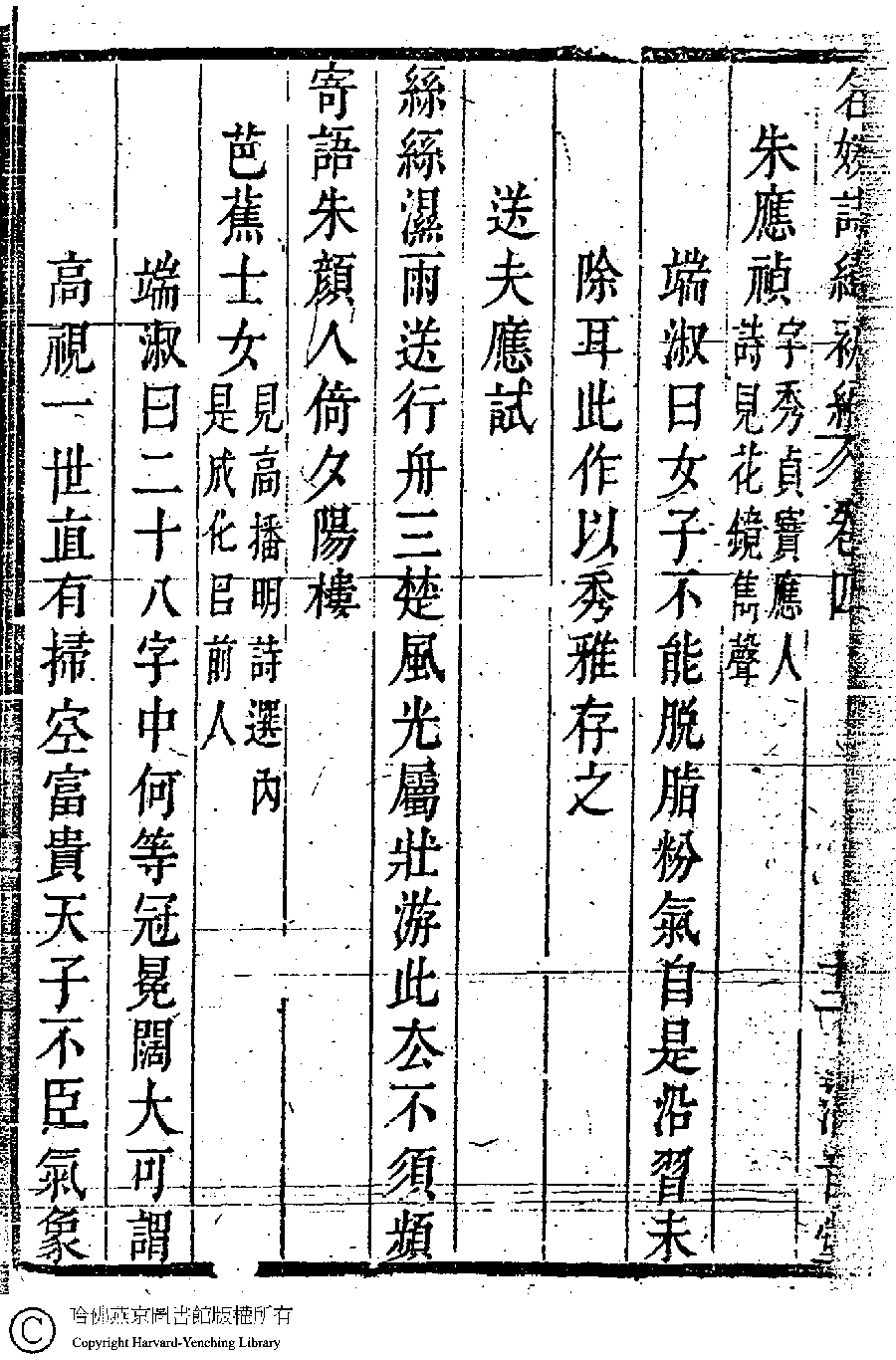| (PRINT FRIENDLY VERSION) 名媛詩緯初編(清王端淑輯)。清康熙六年(1667)清音堂刻本 ![]() Page : 4.12b | click for larger image | Back |