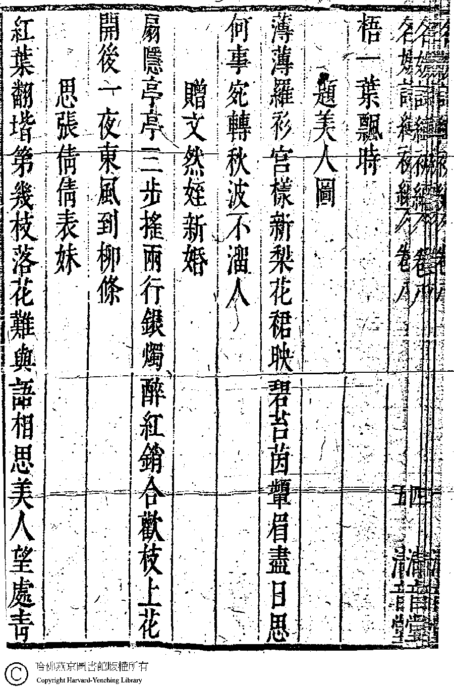 | (PRINT FRIENDLY VERSION) 名媛詩緯初編(清王端淑輯)。清康熙六年(1667)清音堂刻本 ![]() Page : 8.5b | click for larger image | Back |