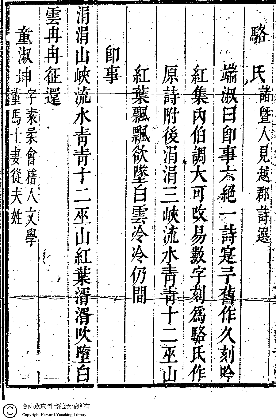 | (PRINT FRIENDLY VERSION) 名媛詩緯初編(清王端淑輯)。清康熙六年(1667)清音堂刻本 ![]() Page : 13.16b | click for larger image | Back |