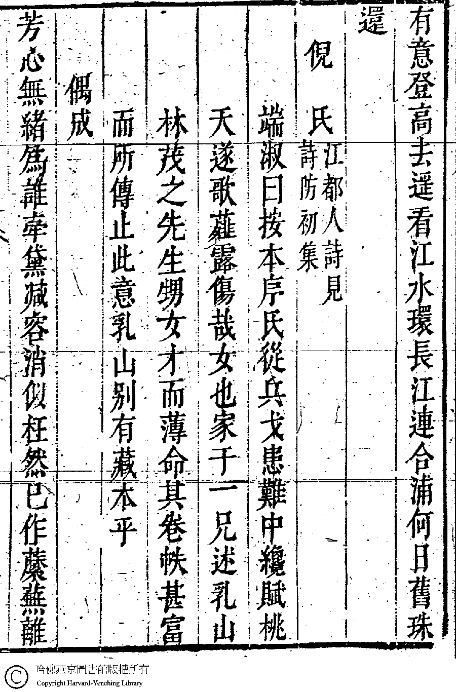 | (PRINT FRIENDLY VERSION) 名媛詩緯初編(清王端淑輯)。清康熙六年(1667)清音堂刻本 ![]() Page : 13.21a | click for larger image | Back |
