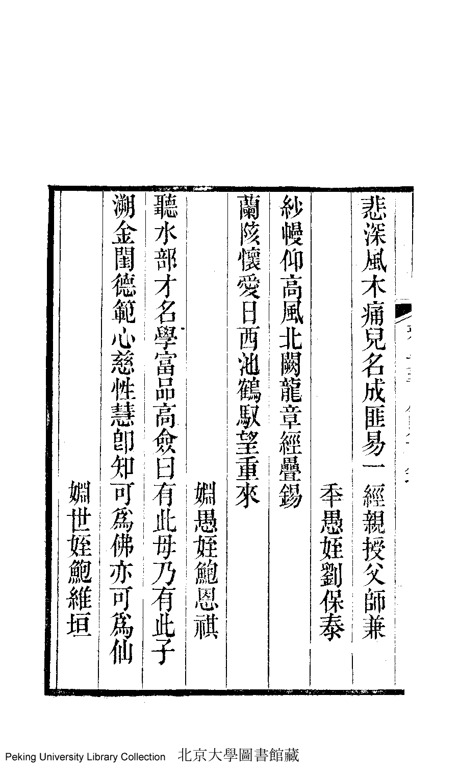 | (PRINT FRIENDLY VERSION) 雅安書屋文集﹕二卷(清汪嫈撰)。道光甲辰(1844)刊本 ![]() Page : 輓楹.3b | click for larger image | Back |
