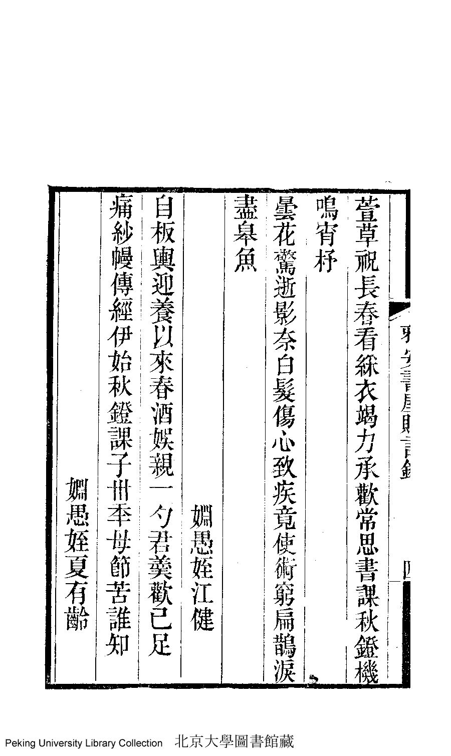 | (PRINT FRIENDLY VERSION) 雅安書屋文集﹕二卷(清汪嫈撰)。道光甲辰(1844)刊本 ![]() Page : 輓楹.4b | click for larger image | Back |