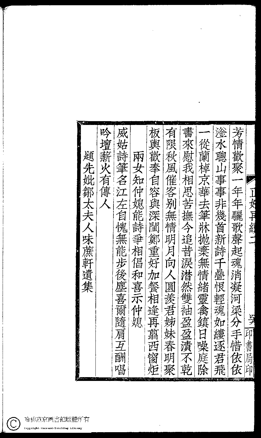 | (PRINT FRIENDLY VERSION) 閨秀正始再續集(民國單士釐輯)。民國元年(1911)活字印本 ![]() Page : 二.49b | click for larger image | Back |