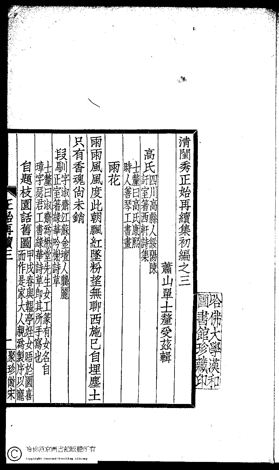 | (PRINT FRIENDLY VERSION) 閨秀正始再續集(民國單士釐輯)。民國元年(1911)活字印本 ![]() Page : 三.1a | click for larger image | Back |