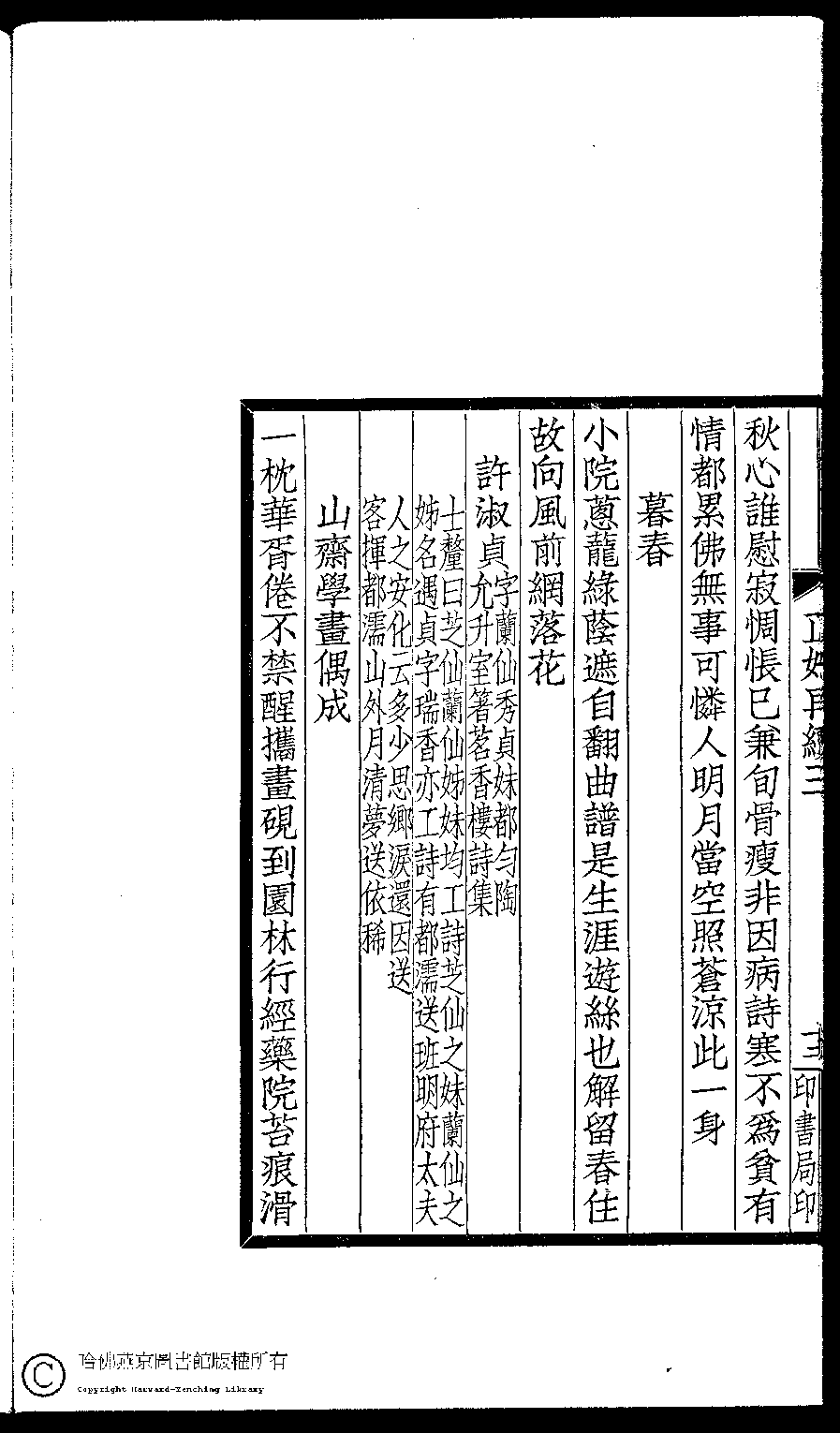 | (PRINT FRIENDLY VERSION) 閨秀正始再續集(民國單士釐輯)。民國元年(1911)活字印本 ![]() Page : 三.12b | click for larger image | Back |