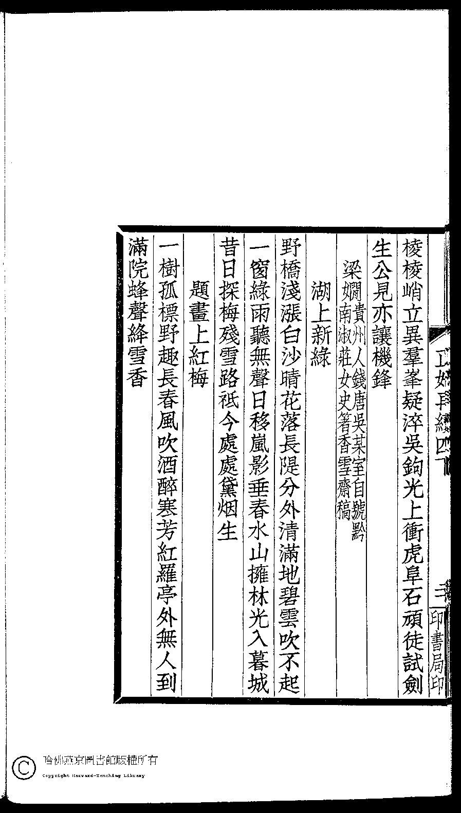 | (PRINT FRIENDLY VERSION) 閨秀正始再續集(民國單士釐輯)。民國元年(1911)活字印本 ![]() Page : 四下.20b | click for larger image | Back |