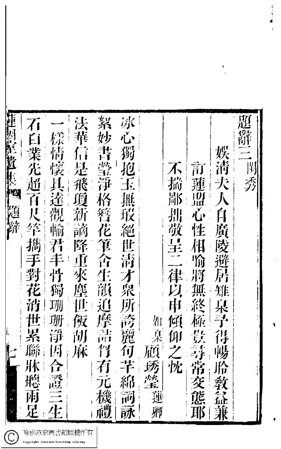 | (PRINT FRIENDLY VERSION) 蓮因室詩集﹕二卷﹐詞集﹕一卷(清鄭蘭孫撰)。清光緒元年(1875)刻本 ![]() Page : 題辭.7b | click for larger image | 蓮因室詩集﹕二卷﹐詞集﹕一卷(清鄭蘭孫撰)。清光緒元年(1875)刻本![]() Page : 題辭.7a | click for larger image | Back |