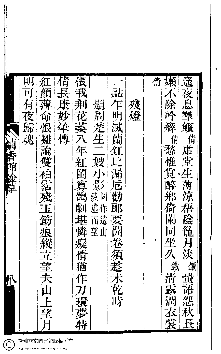 | (PRINT FRIENDLY VERSION) 夢湘樓詩稿﹕二卷﹐詞稿﹕一卷﹔繭香館吟艸﹕一卷﹐繡餘詞草﹕一卷(清宗婉等撰) : 繭香館吟艸﹕一卷。清光緒六年(1880)常熟宗氏刻本 ![]() Page : 8a | click for larger image | Back |
