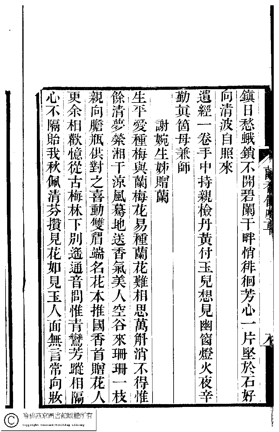 | (PRINT FRIENDLY VERSION) 夢湘樓詩稿﹕二卷﹐詞稿﹕一卷﹔繭香館吟艸﹕一卷﹐繡餘詞草﹕一卷(清宗婉等撰) : 繭香館吟艸﹕一卷。清光緒六年(1880)常熟宗氏刻本 ![]() Page : 8b | click for larger image | 夢湘樓詩稿﹕二卷﹐詞稿﹕一卷﹔繭香館吟艸﹕一卷﹐繡餘詞草﹕一卷(清宗婉等撰) : 繭香館吟艸﹕一卷。清光緒六年(1880)常熟宗氏刻本![]() Page : 8a | click for larger image | Back |