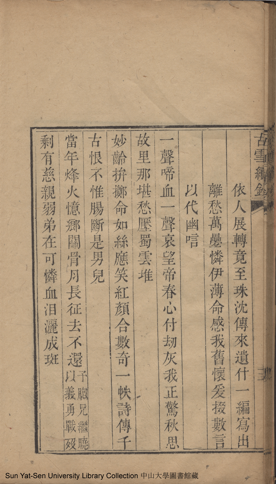 | (PRINT FRIENDLY VERSION) 古雪詩鈔:一卷, 續鈔: 一卷, 詩餘:一卷(清楊繼端撰)。清嘉慶十四年(1809)刻本 ![]() Page : 2.續鈔.16a | click for larger image | 古雪詩鈔:一卷, 續鈔: 一卷, 詩餘:一卷(清楊繼端撰)。清嘉慶十四年(1809)刻本![]() Page : 2.續鈔.15b | click for larger image | 古雪詩鈔:一卷, 續鈔: 一卷, 詩餘:一卷(清楊繼端撰)。清嘉慶十四年(1809)刻本![]() Page : 2.續鈔.15a | click for larger image | Back |
