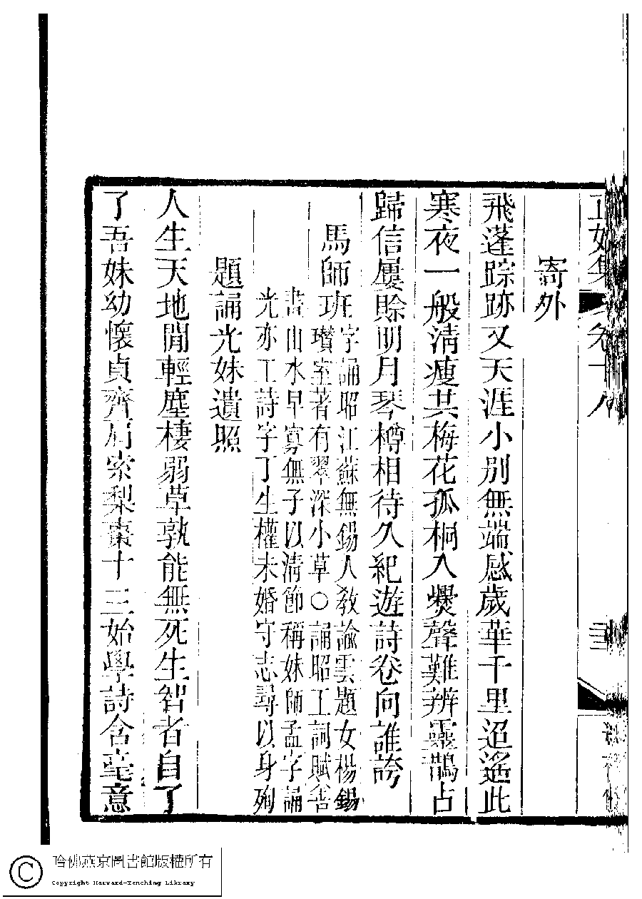 | (PRINT FRIENDLY VERSION) 國朝閨秀正始集﹕二十卷﹐附錄﹕一卷﹐補遺﹕一卷﹐又附題詞﹕一卷(清惲珠輯)。清道光十一年(1831)紅香館刻本。 ![]() Page : 18.22b | click for larger image | Back |