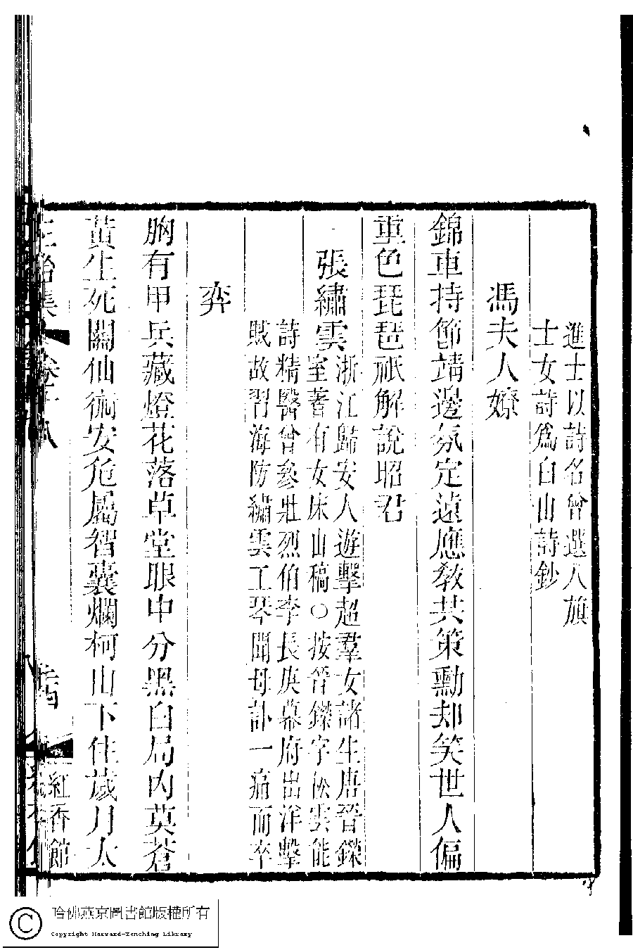 | (PRINT FRIENDLY VERSION) 國朝閨秀正始集﹕二十卷﹐附錄﹕一卷﹐補遺﹕一卷﹐又附題詞﹕一卷(清惲珠輯)。清道光十一年(1831)紅香館刻本。 ![]() Page : 18.24a | click for larger image | 國朝閨秀正始集﹕二十卷﹐附錄﹕一卷﹐補遺﹕一卷﹐又附題詞﹕一卷(清惲珠輯)。清道光十一年(1831)紅香館刻本。![]() Page : 18.23b | click for larger image | Back |