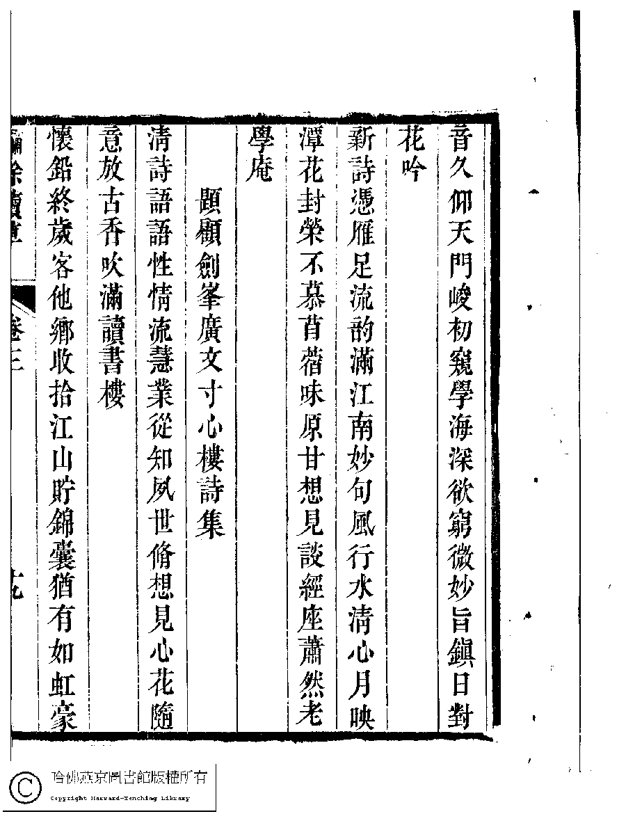 | (PRINT FRIENDLY VERSION) 繡餘續草﹕五卷(清歸懋儀撰)。清道光十二年 (1832)刻本 ![]() Page : 3.19b | click for larger image | 繡餘續草﹕五卷(清歸懋儀撰)。清道光十二年 (1832)刻本![]() Page : 3.19a | click for larger image | Back |