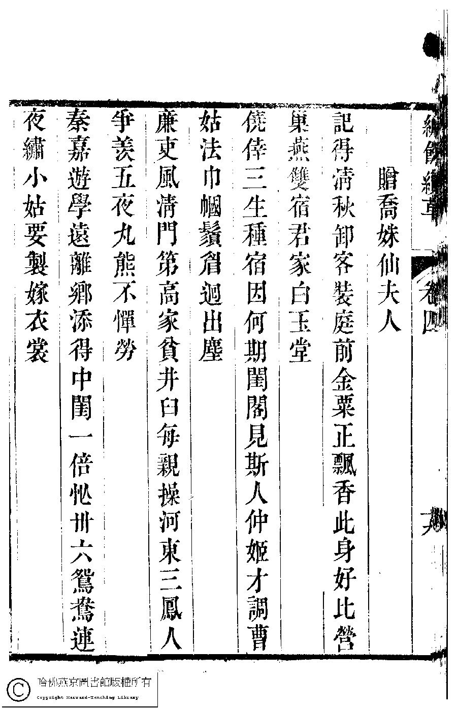 | (PRINT FRIENDLY VERSION) 繡餘續草﹕五卷(清歸懋儀撰)。清道光十二年 (1832)刻本 ![]() Page : 4.20a | click for larger image | 繡餘續草﹕五卷(清歸懋儀撰)。清道光十二年 (1832)刻本![]() Page : 4.19b | click for larger image | Back |