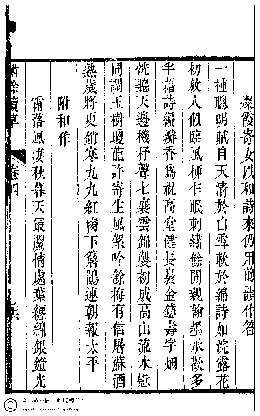 | (PRINT FRIENDLY VERSION) 繡餘續草﹕五卷(清歸懋儀撰)。清道光十二年 (1832)刻本 ![]() Page : 4.26b | click for larger image | 繡餘續草﹕五卷(清歸懋儀撰)。清道光十二年 (1832)刻本![]() Page : 4.26a | click for larger image | Back |