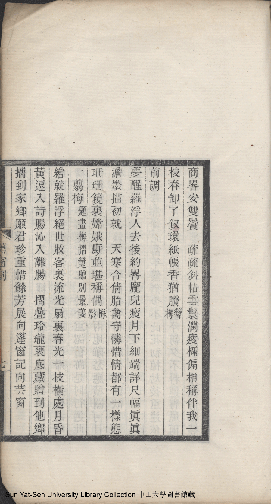 | (PRINT FRIENDLY VERSION) 清足居集:一卷, 蕉窗詞:一卷(清鄧瑜撰)。光緒二十一年乙未(1895)泉唐諸氏家刻本 ![]() Page : 1.7a | click for larger image | 清足居集:一卷, 蕉窗詞:一卷(清鄧瑜撰)。光緒二十一年乙未(1895)泉唐諸氏家刻本![]() Page : 1.6b | click for larger image | Back |