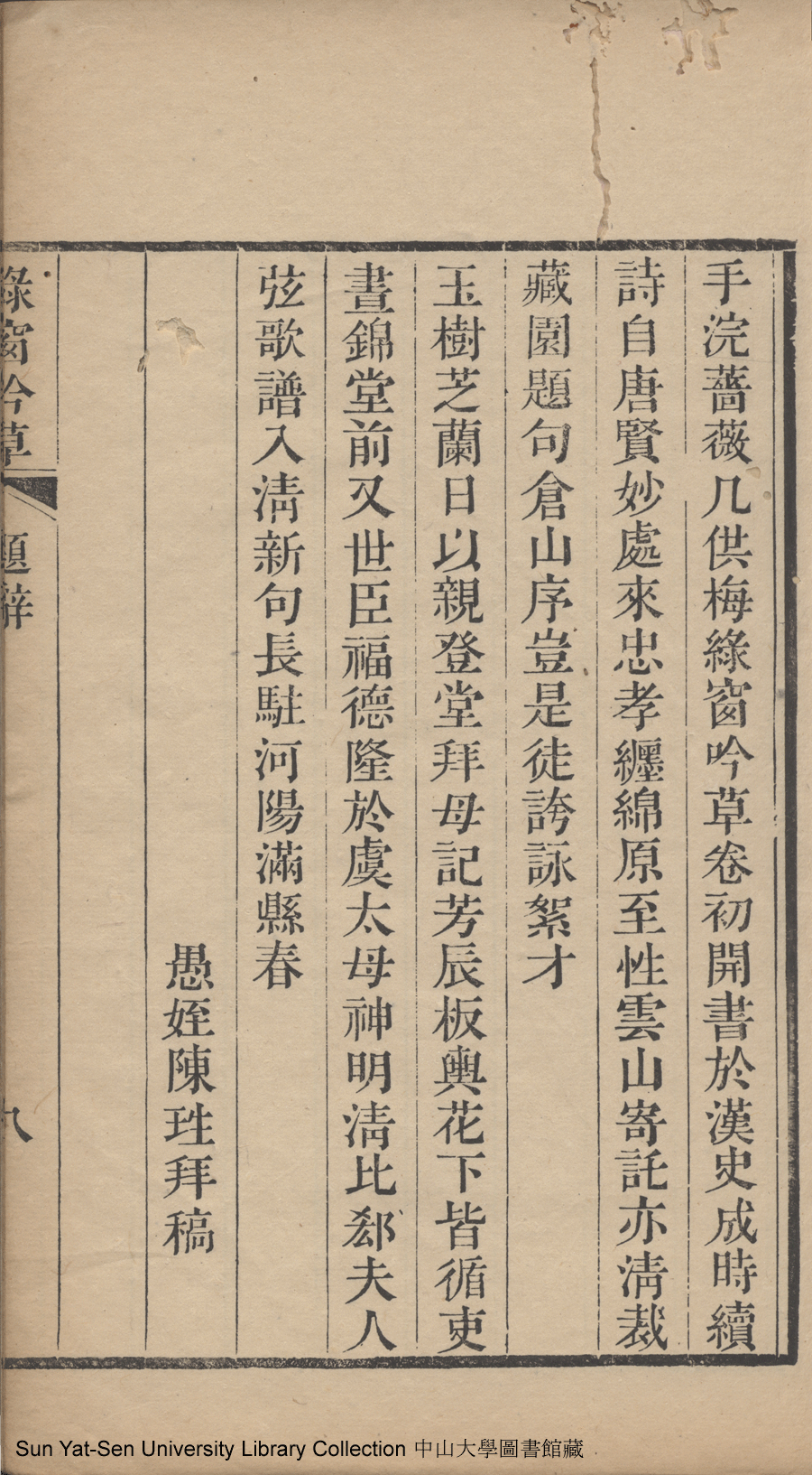 | (PRINT FRIENDLY VERSION) 綠窗吟草: 一卷(清楊瓊華撰)。道光十二年壬辰(1832)刊本 ![]() Page : 題辭8b | click for larger image | 綠窗吟草: 一卷(清楊瓊華撰)。道光十二年壬辰(1832)刊本![]() Page : 題辭8a | click for larger image | Back |