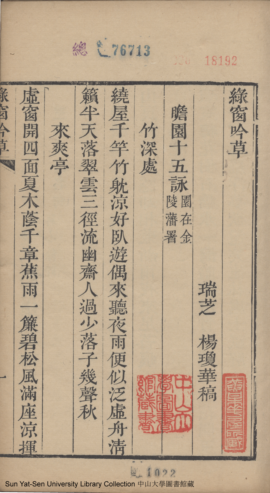 | (PRINT FRIENDLY VERSION) 綠窗吟草: 一卷(清楊瓊華撰)。道光十二年壬辰(1832)刊本 ![]() Page : 綠窗吟草1a | click for larger image | Back |