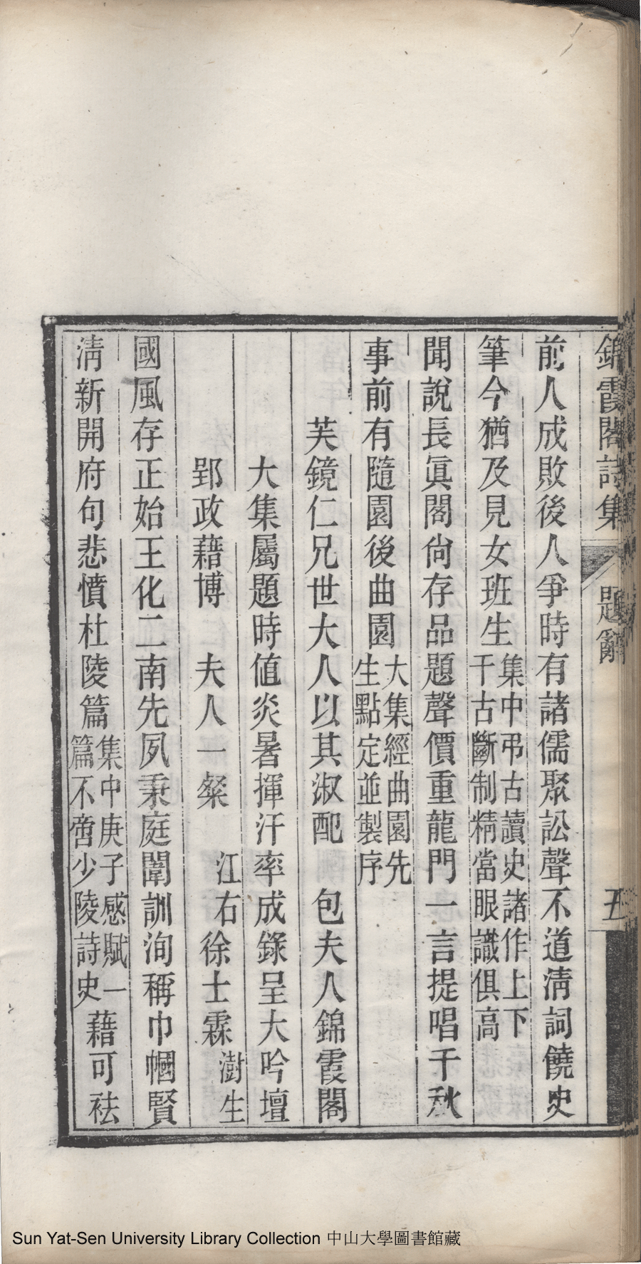 | (PRINT FRIENDLY VERSION) 錦霞閣詩集:五卷,詞集:一卷(清包蘭瑛撰)。宣統二年庚戌(1910)刊本 ![]() Page : 題辭6a | click for larger image | 錦霞閣詩集:五卷,詞集:一卷(清包蘭瑛撰)。宣統二年庚戌(1910)刊本![]() Page : 題辭5b | click for larger image | Back |