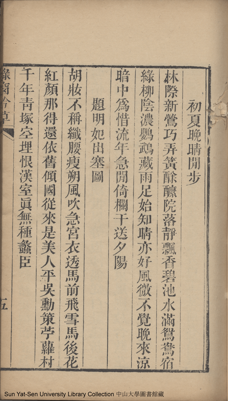 | (PRINT FRIENDLY VERSION) 綠窗吟草: 一卷(清楊瓊華撰)。道光十二年壬辰(1832)刊本 ![]() Page : 綠窗吟草5a | click for larger image | Back |
