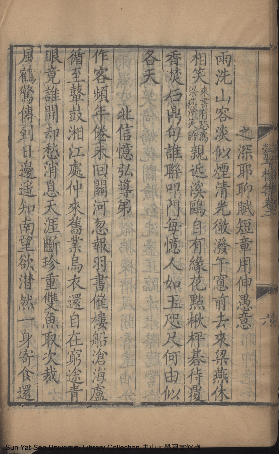 | (PRINT FRIENDLY VERSION) 凝翠樓集:四卷(清王慧撰)。康熙四十七年戊子(1708)朱氏銀槎閣精刊本 ![]() Page : 卷二7a | click for larger image | 凝翠樓集:四卷(清王慧撰)。康熙四十七年戊子(1708)朱氏銀槎閣精刊本![]() Page : 卷二6b | click for larger image | Back |