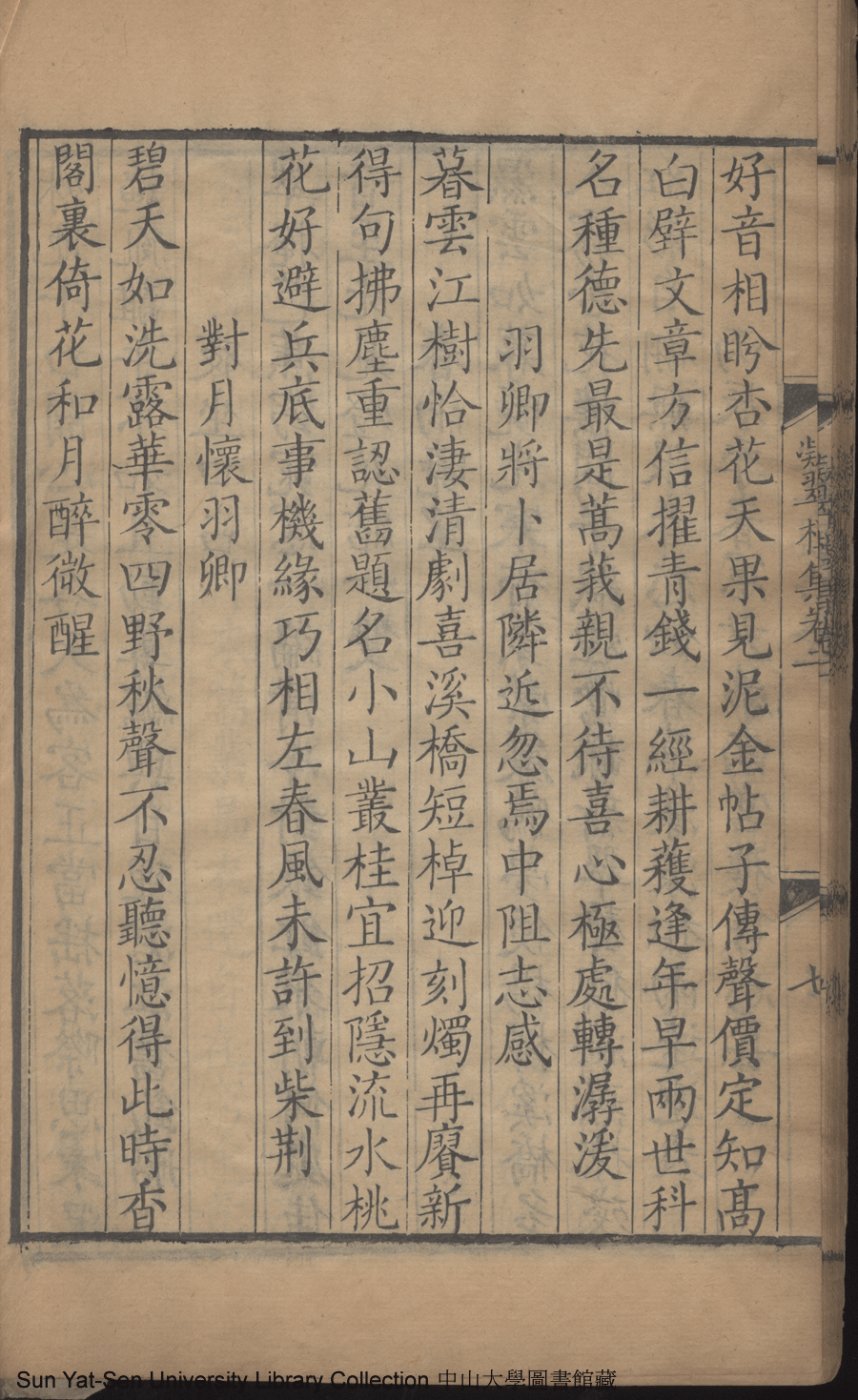 | (PRINT FRIENDLY VERSION) 凝翠樓集:四卷(清王慧撰)。康熙四十七年戊子(1708)朱氏銀槎閣精刊本 ![]() Page : 卷二7b | click for larger image | Back |