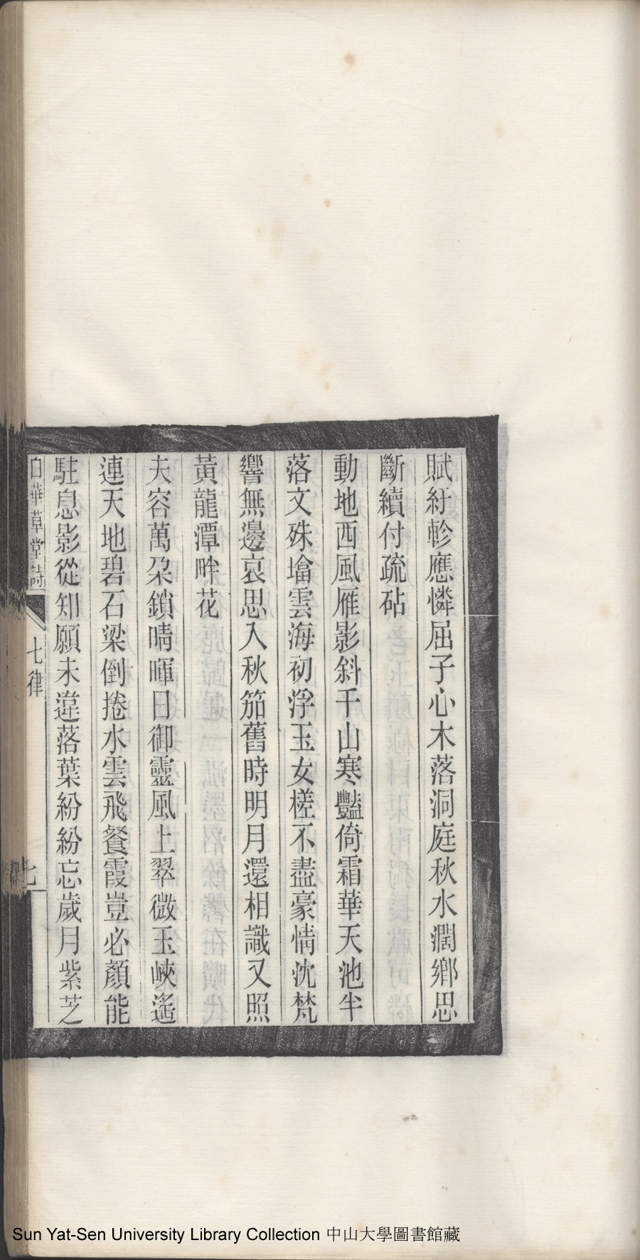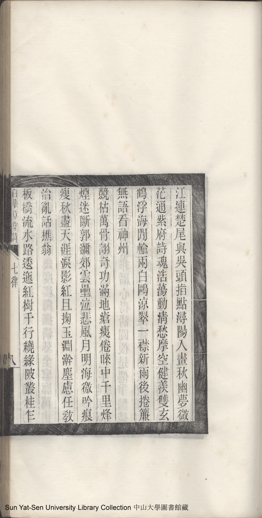 | (PRINT FRIENDLY VERSION) 白華草堂詩:六卷,玉尺樓詩:一卷(清張昭漢撰) ![]() Page : 七律8a | click for larger image | 白華草堂詩:六卷,玉尺樓詩:一卷(清張昭漢撰)![]() Page : 七律7b | click for larger image | 白華草堂詩:六卷,玉尺樓詩:一卷(清張昭漢撰)![]() Page : 七律7a | click for larger image | 白華草堂詩:六卷,玉尺樓詩:一卷(清張昭漢撰)![]() Page : 七律6b | click for larger image |