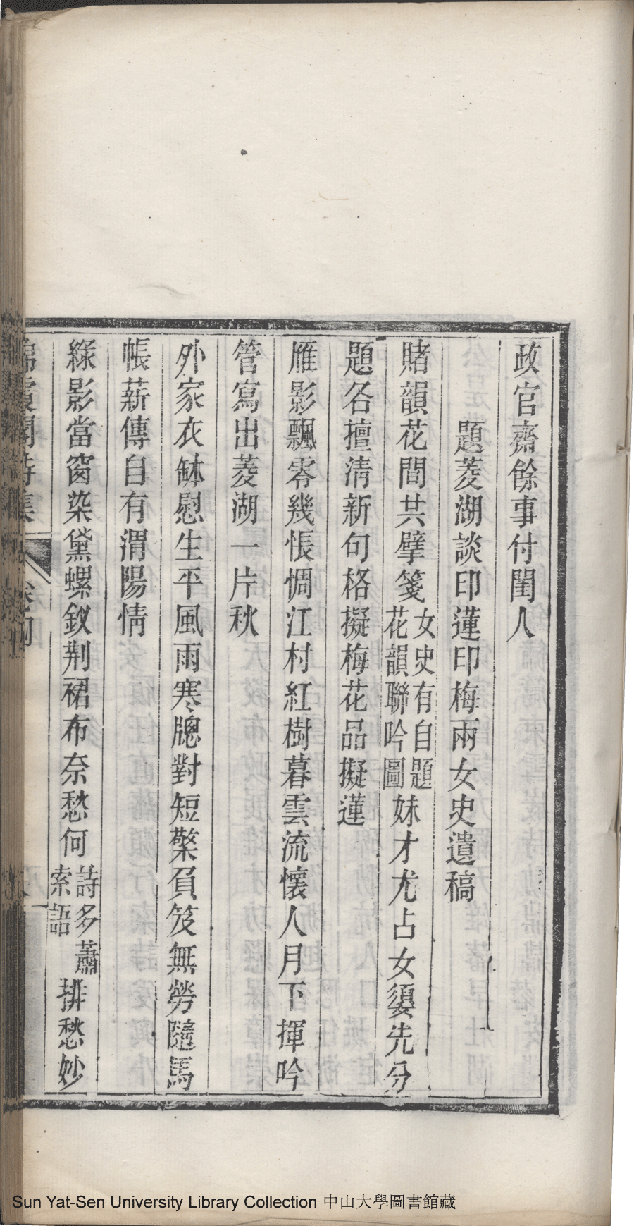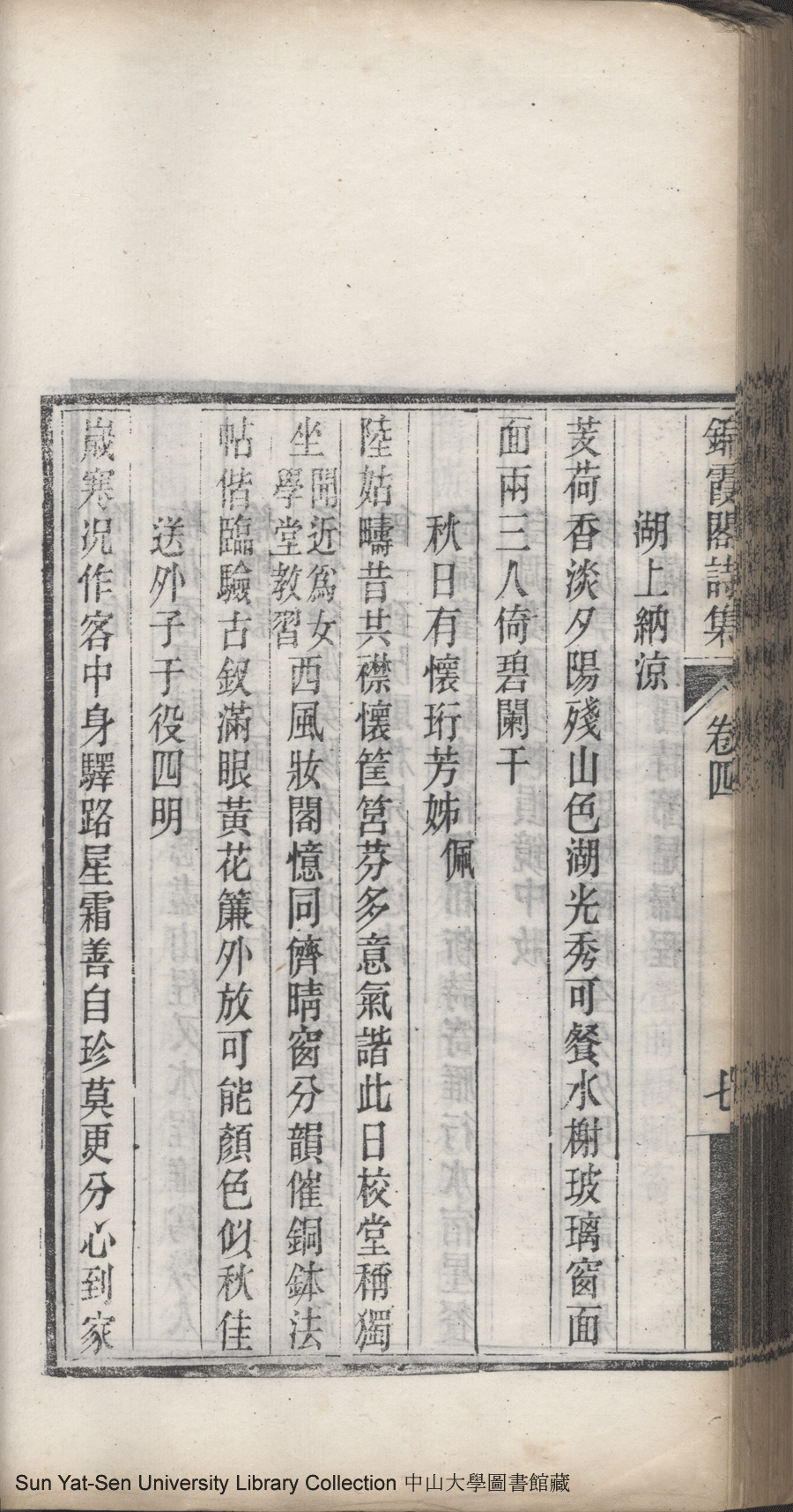 | (PRINT FRIENDLY VERSION) 錦霞閣詩集:五卷,詞集:一卷(清包蘭瑛撰)。宣統二年庚戌(1910)刊本 ![]() Page : 卷四8a | click for larger image | 錦霞閣詩集:五卷,詞集:一卷(清包蘭瑛撰)。宣統二年庚戌(1910)刊本![]() Page : 卷四7b | click for larger image | Back |