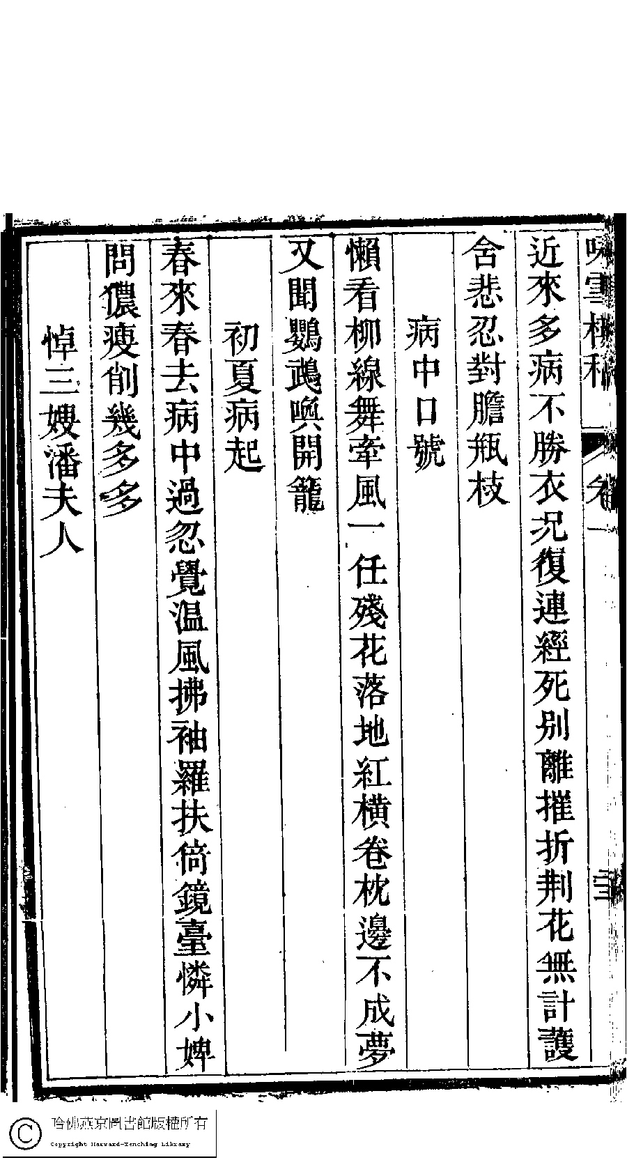 | (PRINT FRIENDLY VERSION) 詠雪樓稿﹕五卷,卷首一卷,附一卷(清甘立媃撰)。清道光二十三年(1843)徐心田半偈齋刻本。 ![]() Page : 1.22b | click for larger image | 詠雪樓稿﹕五卷,卷首一卷,附一卷(清甘立媃撰)。清道光二十三年(1843)徐心田半偈齋刻本。![]() Page : 1.22a | click for larger image | Back |