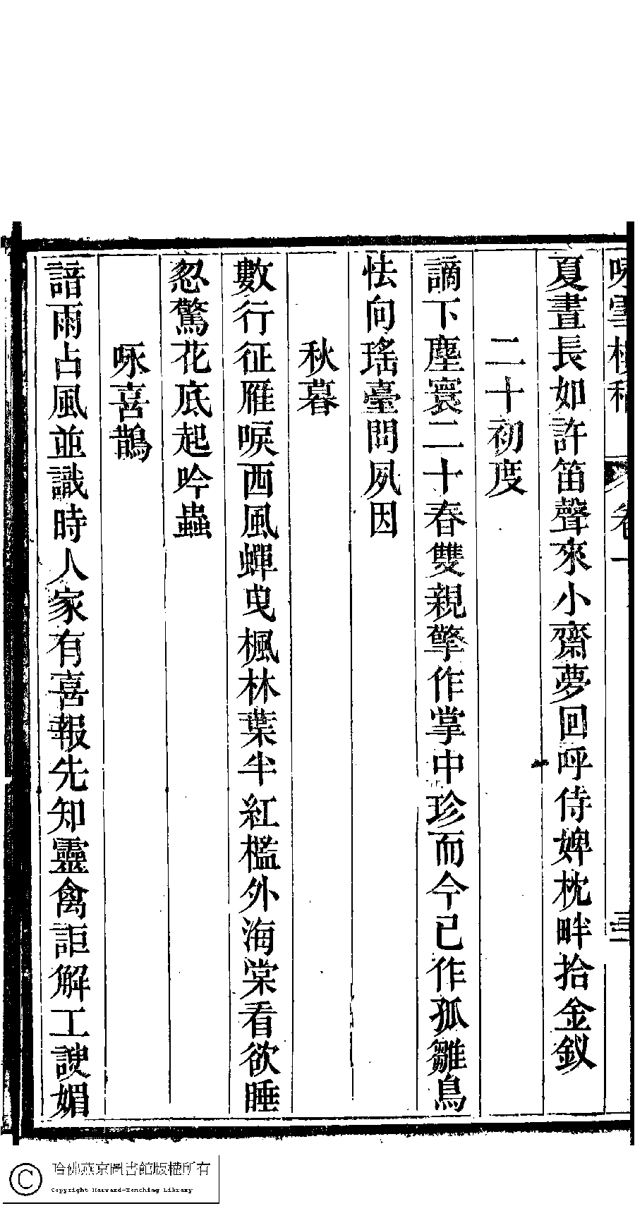 | (PRINT FRIENDLY VERSION) 詠雪樓稿﹕五卷,卷首一卷,附一卷(清甘立媃撰)。清道光二十三年(1843)徐心田半偈齋刻本。 ![]() Page : 1.31b | click for larger image | Back |