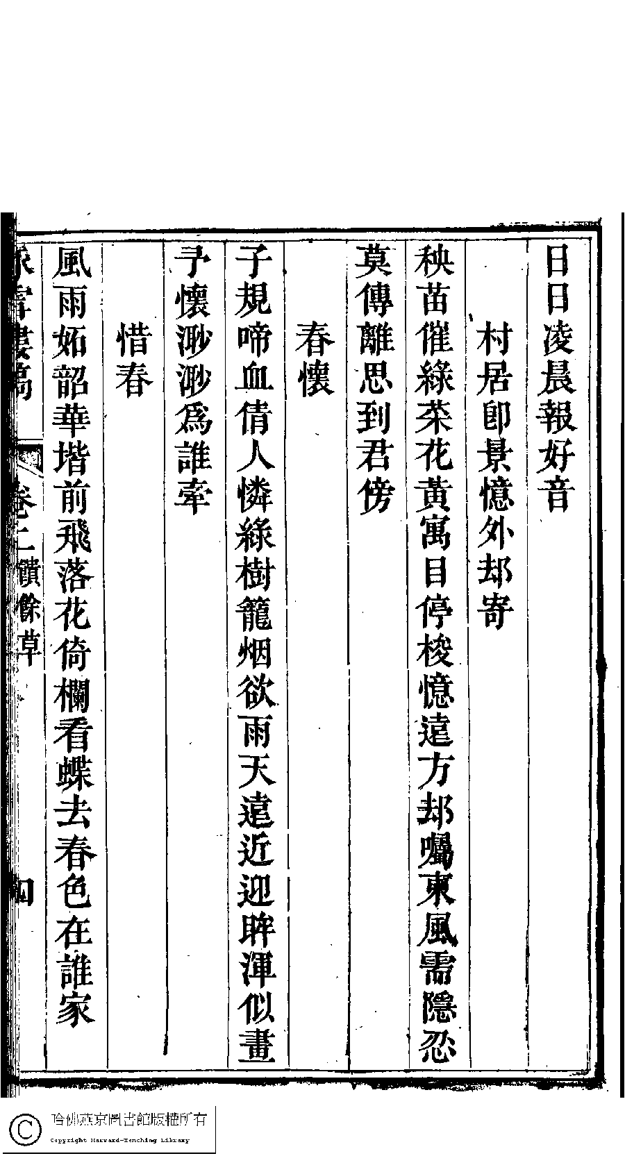 | (PRINT FRIENDLY VERSION) 詠雪樓稿﹕五卷,卷首一卷,附一卷(清甘立媃撰)。清道光二十三年(1843)徐心田半偈齋刻本。 ![]() Page : 2.4a | click for larger image | Back |