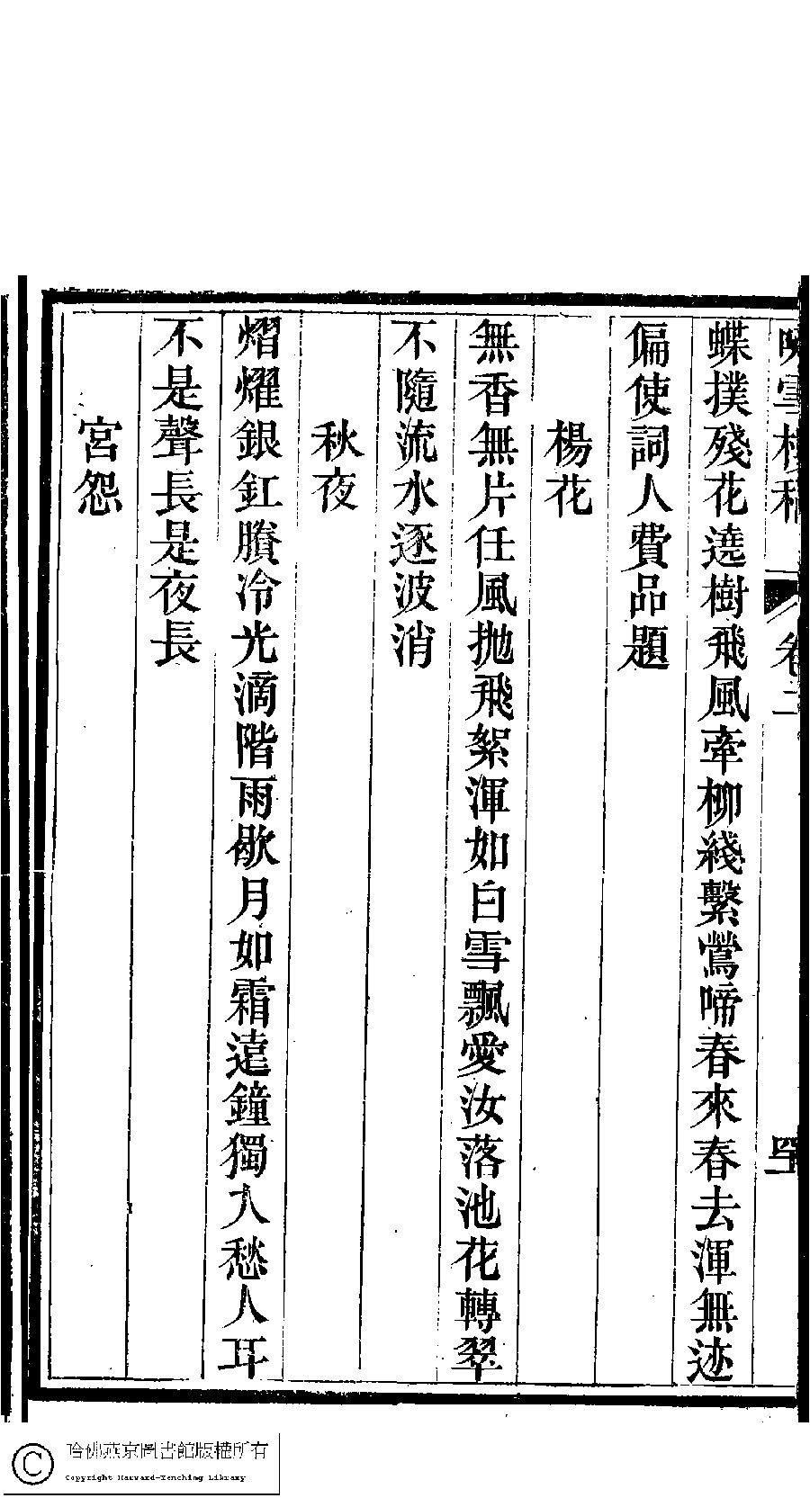 | (PRINT FRIENDLY VERSION) 詠雪樓稿﹕五卷,卷首一卷,附一卷(清甘立媃撰)。清道光二十三年(1843)徐心田半偈齋刻本。 ![]() Page : 2.41b | click for larger image | Back |