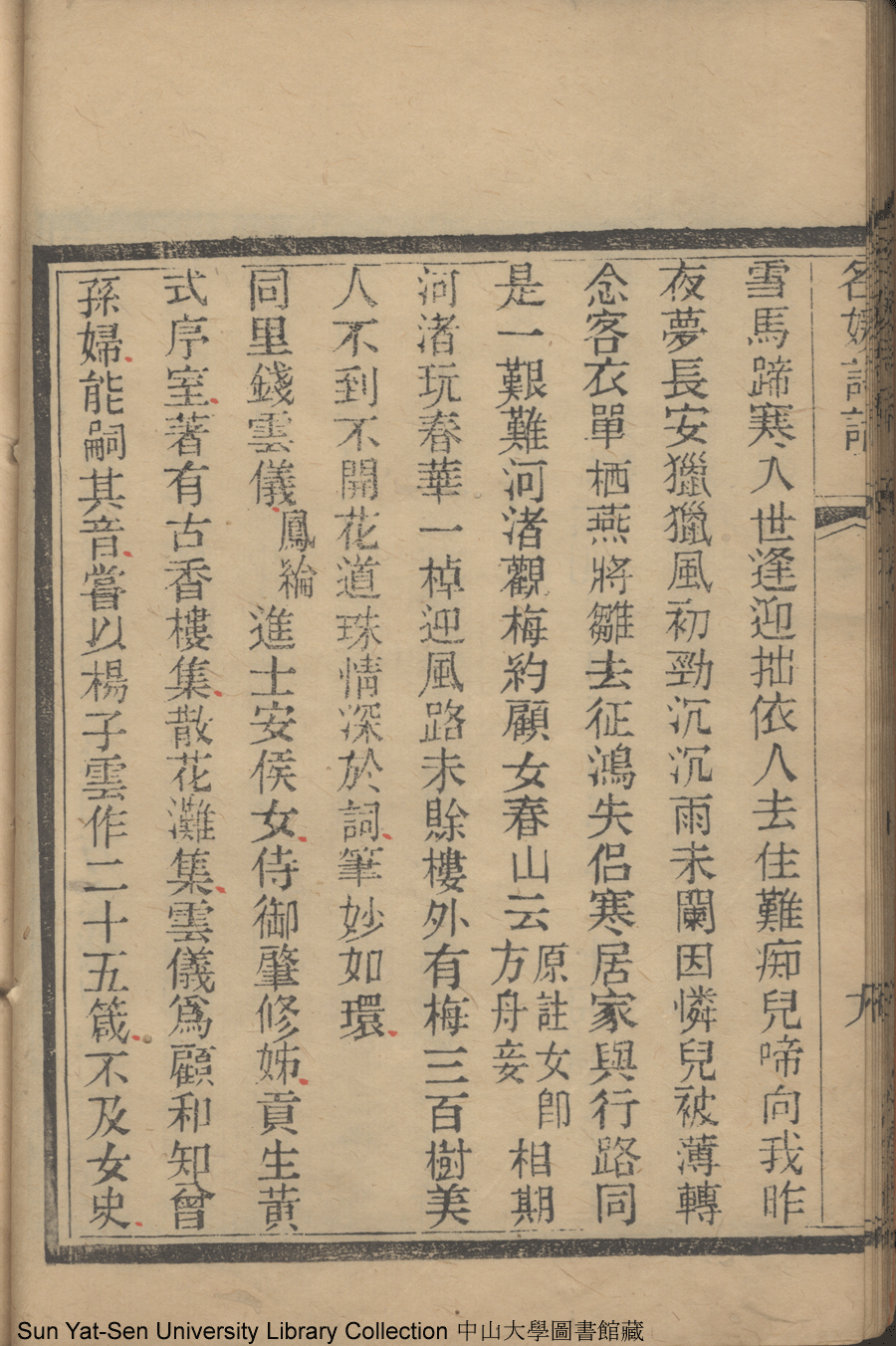 | (PRINT FRIENDLY VERSION) 名媛詩話十二卷續集三卷: 十五卷(清沈善寶撰)。清光緒五年(1879)鴻雪樓刻巾箱本 ![]() Page : 卷一10a | click for larger image | 名媛詩話十二卷續集三卷: 十五卷(清沈善寶撰)。清光緒五年(1879)鴻雪樓刻巾箱本![]() Page : 卷一9b | click for larger image | Back |