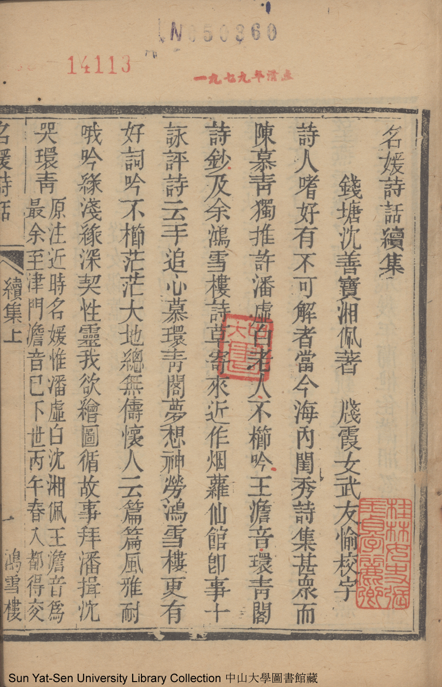 | (PRINT FRIENDLY VERSION) 名媛詩話十二卷續集三卷: 十五卷(清沈善寶撰)。清光緒五年(1879)鴻雪樓刻巾箱本 ![]() Page : 續集上1a | click for larger image | Back |