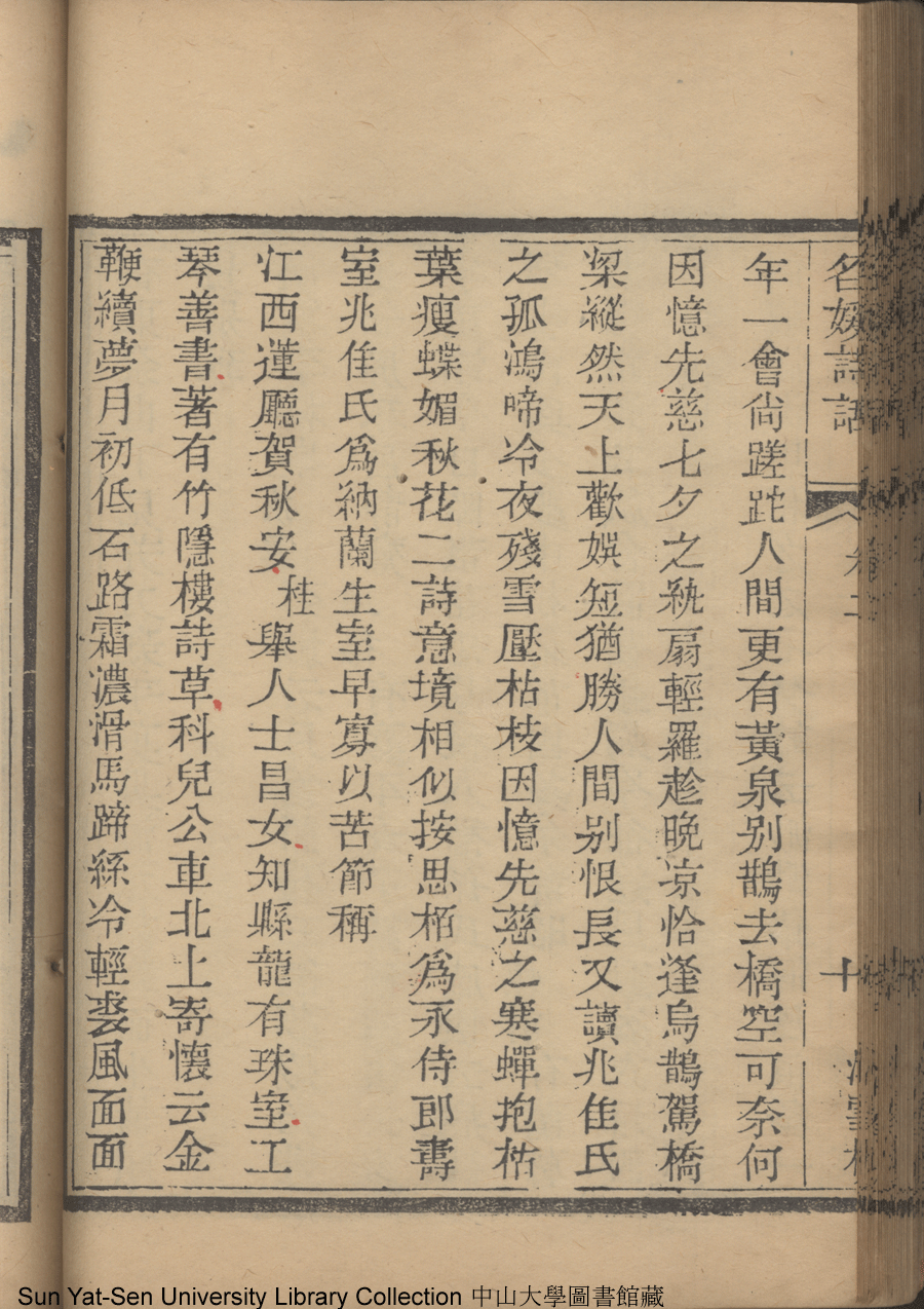 | (PRINT FRIENDLY VERSION) 名媛詩話十二卷續集三卷: 十五卷(清沈善寶撰)。清光緒五年(1879)鴻雪樓刻巾箱本 ![]() Page : 卷二10b | click for larger image | 名媛詩話十二卷續集三卷: 十五卷(清沈善寶撰)。清光緒五年(1879)鴻雪樓刻巾箱本![]() Page : 卷二10a | click for larger image | Back |