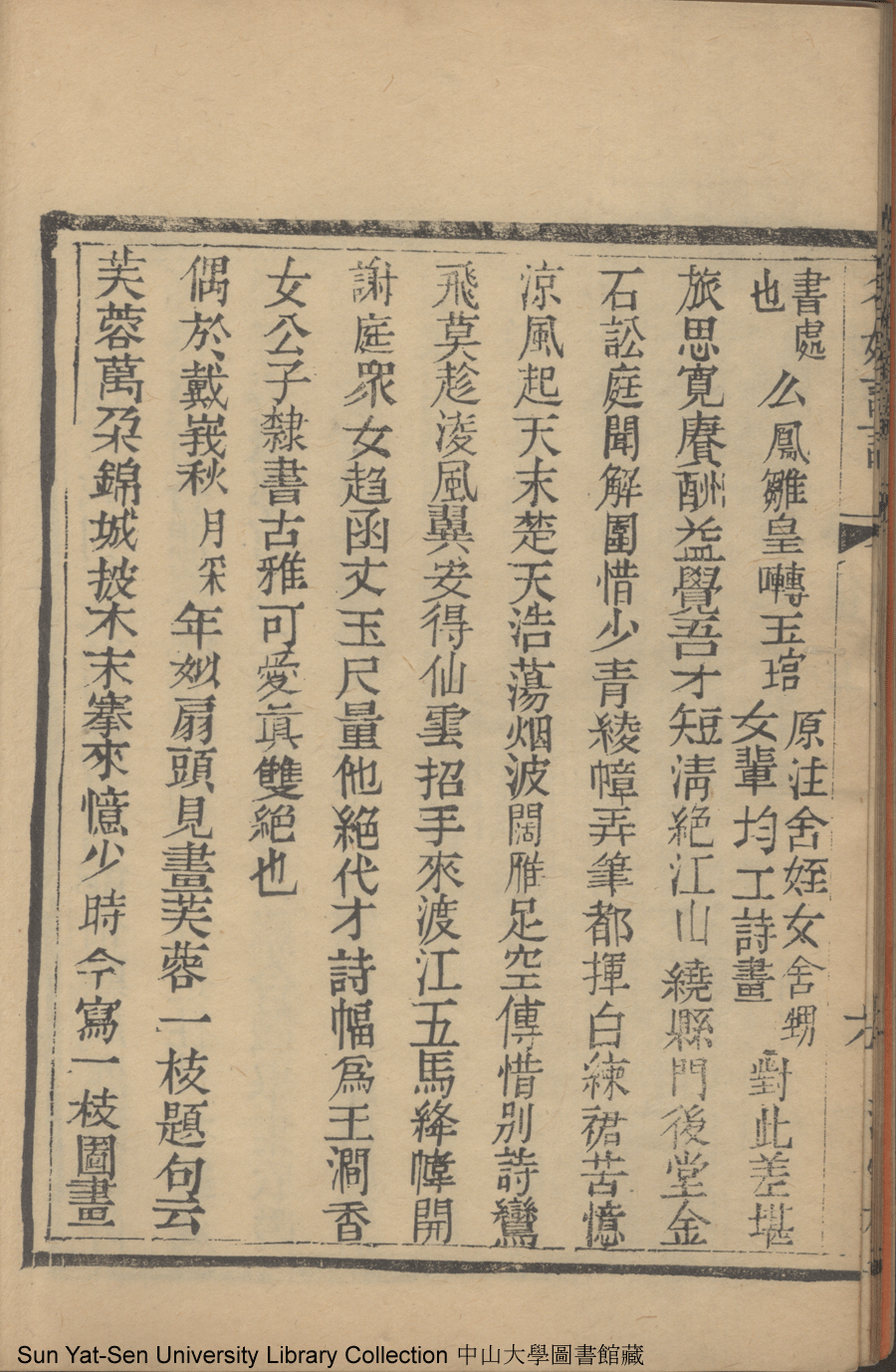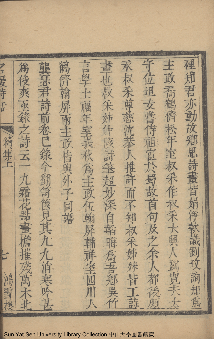 | (PRINT FRIENDLY VERSION) 名媛詩話十二卷續集三卷: 十五卷(清沈善寶撰)。清光緒五年(1879)鴻雪樓刻巾箱本 ![]() Page : 續集上7a | click for larger image | 名媛詩話十二卷續集三卷: 十五卷(清沈善寶撰)。清光緒五年(1879)鴻雪樓刻巾箱本![]() Page : 續集上6b | click for larger image | Back |