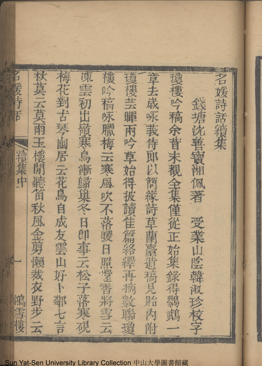 | (PRINT FRIENDLY VERSION) 名媛詩話十二卷續集三卷: 十五卷(清沈善寶撰)。清光緒五年(1879)鴻雪樓刻巾箱本 ![]() Page : 續集中1a | click for larger image | Back |