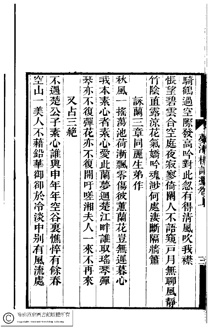 | (PRINT FRIENDLY VERSION) 夢湘樓詩稿﹕二卷﹐詞稿﹕一卷﹔繭香館吟艸﹕一卷﹐繡餘詞草﹕一卷(清宗婉等撰) : 夢湘樓詩稿﹕二卷﹐詞稿﹕一卷。清光緒六年(1880)常熟宗氏刻本 ![]() Page : 上.3b | click for larger image | 夢湘樓詩稿﹕二卷﹐詞稿﹕一卷﹔繭香館吟艸﹕一卷﹐繡餘詞草﹕一卷(清宗婉等撰)。清光緒六年(1880)常熟宗氏刻本![]() Page : 上.3b | click for larger image | Back |