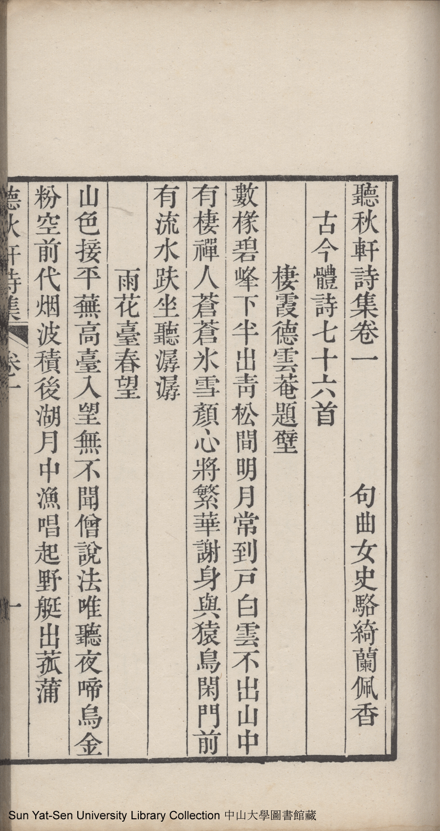 | (PRINT FRIENDLY VERSION) 聽秋軒詩集:六卷(清駱綺蘭撰)。清嘉慶金陵龔氏刻本 ![]() Page : 卷一1a | click for larger image | Back |