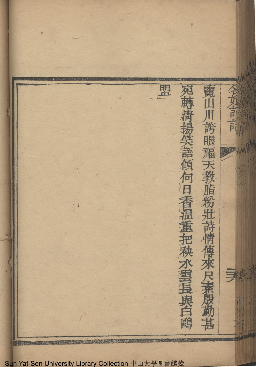 | (PRINT FRIENDLY VERSION) 名媛詩話十二卷續集三卷: 十五卷(清沈善寶撰)。清光緒五年(1879)鴻雪樓刻巾箱本 ![]() Page : 卷五26b | click for larger image | 名媛詩話十二卷續集三卷: 十五卷(清沈善寶撰)。清光緒五年(1879)鴻雪樓刻巾箱本![]() Page : 卷五26a | click for larger image | Back |