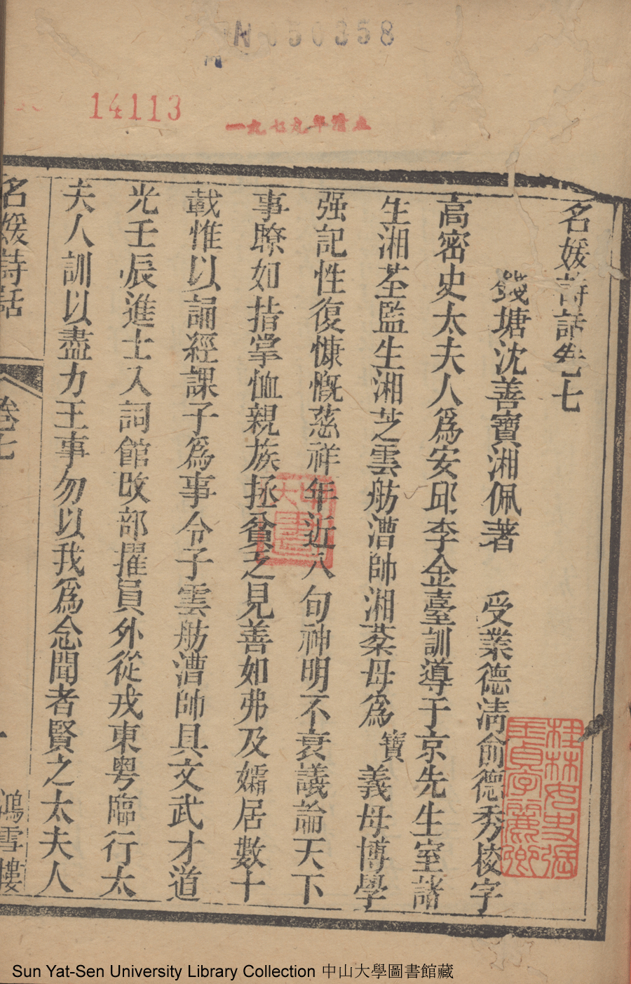 | (PRINT FRIENDLY VERSION) 名媛詩話十二卷續集三卷: 十五卷(清沈善寶撰) ![]() Page : 卷七2b | click for larger image | 名媛詩話十二卷續集三卷: 十五卷(清沈善寶撰)![]() Page : 卷七2a | click for larger image | 名媛詩話十二卷續集三卷: 十五卷(清沈善寶撰)![]() Page : 卷七1b | click for larger image | 名媛詩話十二卷續集三卷: 十五卷(清沈善寶撰)![]() Page : 卷七1a | click for larger image |