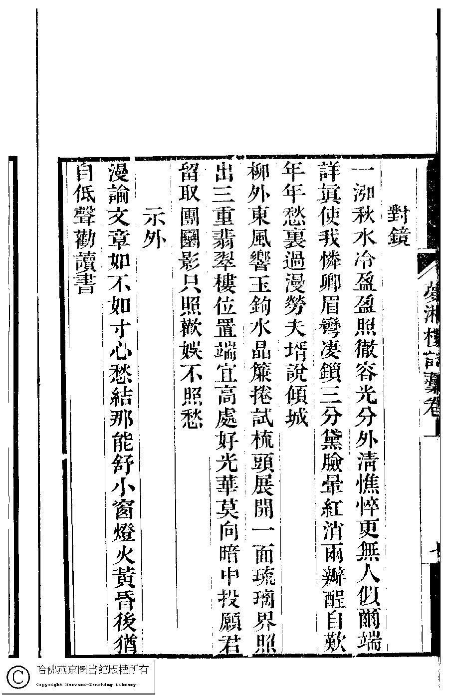 | (PRINT FRIENDLY VERSION) 夢湘樓詩稿﹕二卷﹐詞稿﹕一卷﹔繭香館吟艸﹕一卷﹐繡餘詞草﹕一卷(清宗婉等撰) : 夢湘樓詩稿﹕二卷﹐詞稿﹕一卷。清光緒六年(1880)常熟宗氏刻本 ![]() Page : 上.7b | click for larger image | 夢湘樓詩稿﹕二卷﹐詞稿﹕一卷﹔繭香館吟艸﹕一卷﹐繡餘詞草﹕一卷(清宗婉等撰)。清光緒六年(1880)常熟宗氏刻本![]() Page : 上.7b | click for larger image | Back |