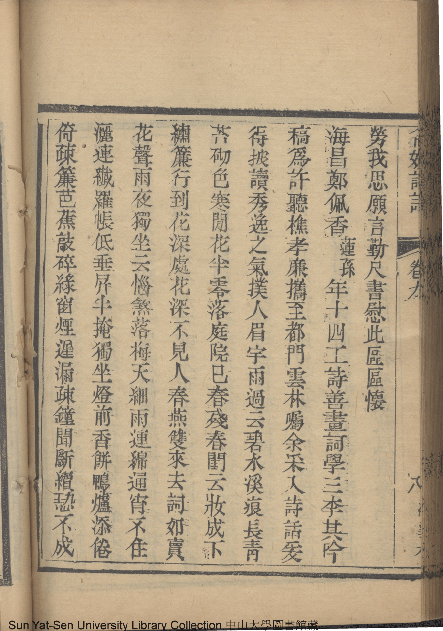 | (PRINT FRIENDLY VERSION) 名媛詩話十二卷續集三卷: 十五卷(清沈善寶撰)。清光緒五年(1879)鴻雪樓刻巾箱本 ![]() Page : 卷九9a | click for larger image | 名媛詩話十二卷續集三卷: 十五卷(清沈善寶撰)。清光緒五年(1879)鴻雪樓刻巾箱本![]() Page : 卷九8b | click for larger image | Back |